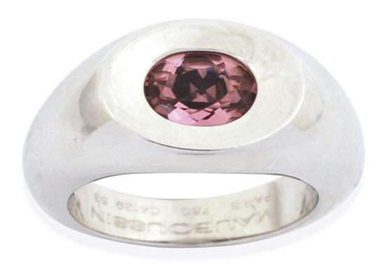 Of modern design, the wide band centrally set with an oval tourmaline weighing 0.95cts, in a concave mount, in 18ct white gold, ring size L-M.