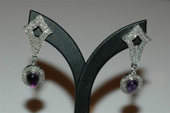 Each earring comprising an open kite shaped plaque, suspending an articulated diamond drop and an oval cluster centrally set with an oval amethyst cut en cabochon, surrounded by diamonds, to post and butterfly fittings, in 18ct white gold.
