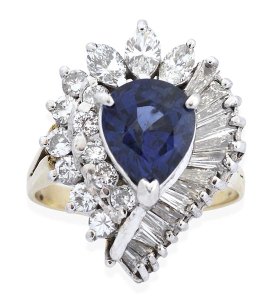 Of cluster design, centrally set with a pear cut sapphire, surrounded by a border of baguette and round brilliant cut diamonds, in 14ct gold, ring size K-L.