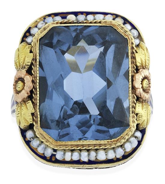 A TOPAZ, SEED PEARL AND ENAMEL RING