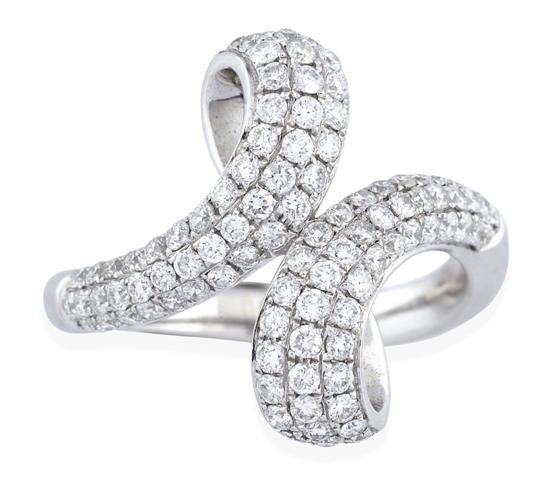 Of crossover scrolled design, pave set with round brilliant cut diamonds totalling 1.00cts, in 18ct white gold, ring size M-N.
