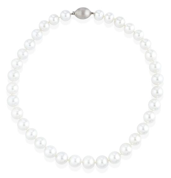 Comprising thirty five baroque pearls of silver white hues, measuring 11.2mm to 13.4mm, to a brushed oval clasp, in 14ct white gold, total length 460mm.