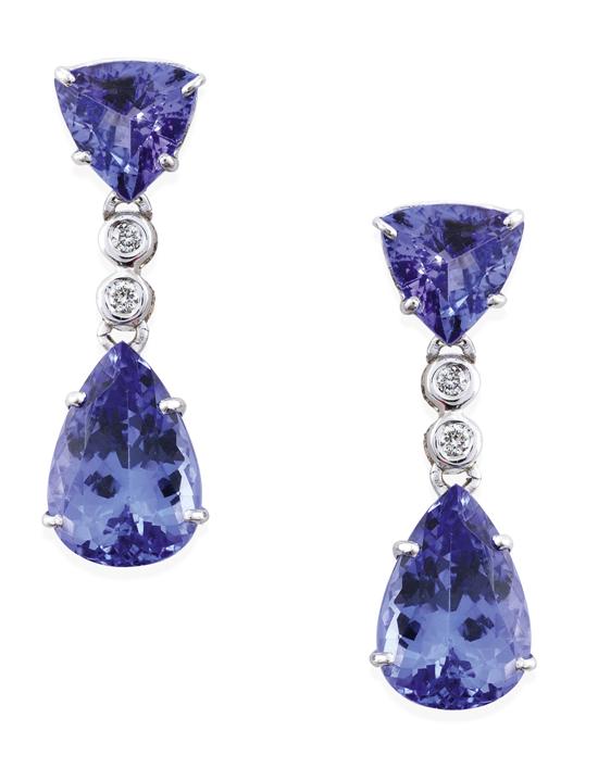 Each earring set with a pear cut tanzanite, suspended below two round brilliant cut diamonds and a trilliant cut tanzanite stud fitting, in 18ct white gold.