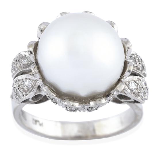 The round pearl of silver white hues measuring 13.9mm, centred within a scalloped diamond set surround, and scrolled diamond set shoulders, in 18ct white gold and platinum, ring size P-Q.