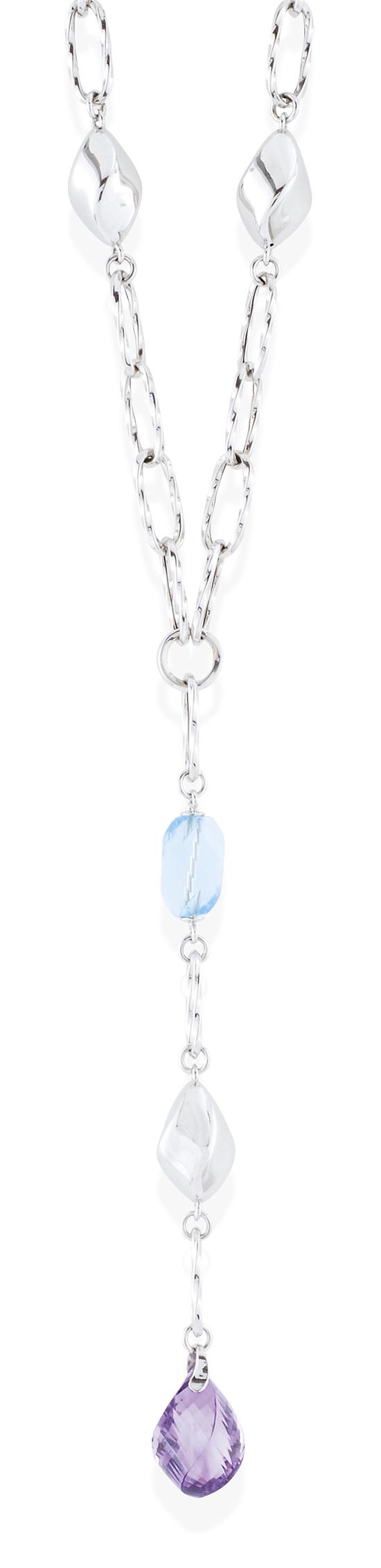 The fancy elongated belcher link chain with fancy cut topaz and amethyst set drop, in 18ct white gold, total length 560mm.