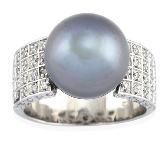 Centrally set with a round pearl of grey green hues, measuring 12.2mm within a wide band with pave diamond set shoulders, in platinum, independent valuation available, ring size I-J.