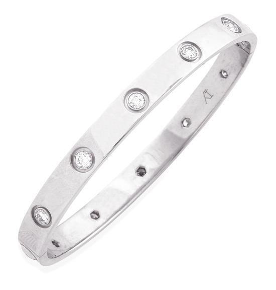 The flat bangle set with ten round brilliant cut diamonds, in 18ct white gold, size 17, with integral screwdriver and original box.