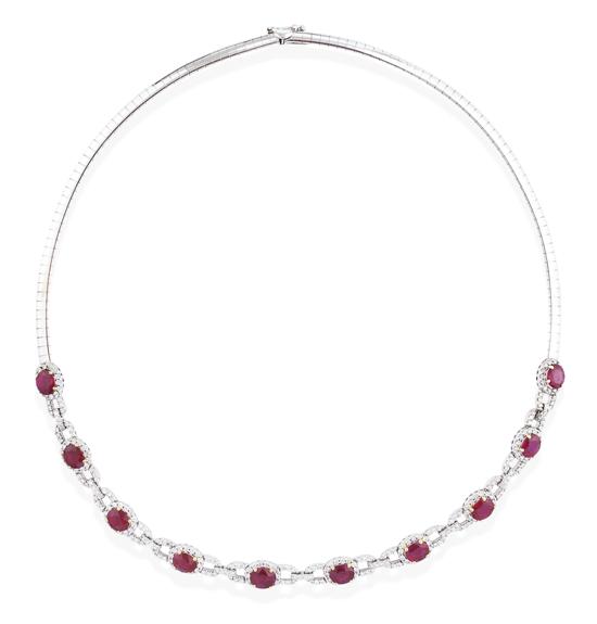 Comprising ten oval rubies mounted within diamond set links, suspended on a flat link collar, in 18ct white gold, independent valuation available.