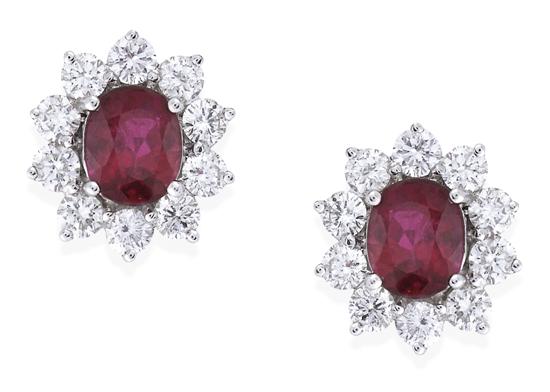 Of cluster design, each earring centrally set with an oval ruby weighing 0.75cts, surrounded by a border of round brilliant cut diamonds, to post and butterfly fittings, in 18ct white gold, independent valuation available.