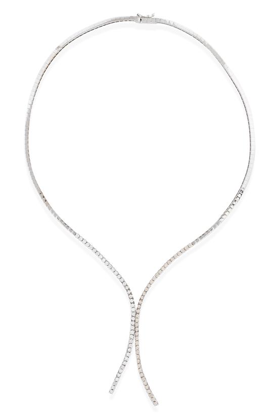 Comprising parallel drops, one of white and one of cognac round brilliant cut diamonds, altogether totalling 1.70cts, suspended on square polished links, in 18ct white gold, independent valuation available.