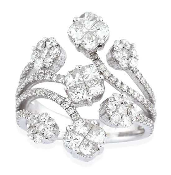 Comprising seven diamond set floral clusters within sweeping split diamond set shoulders, in 18ct white gold, independent valuation available, ring size L-M.