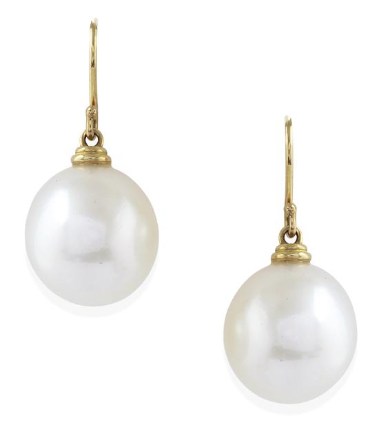 Each earring comprising a near round pearl of creamy white hues, measuring 14.1mm to shepherd hook fittings, in 18ct gold.