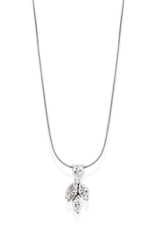 Comprising a pear cut diamond above three marquise cut diamonds, altogether totalling 1.06cts, suspended on a snake chain, in 18ct white gold, independent valuation available.