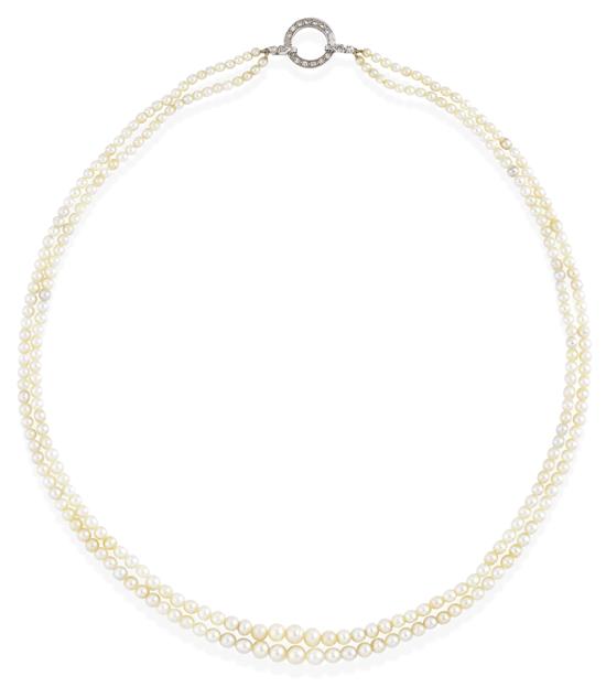Comprising a double strand of graduated natural pearls measuring 3.0mm to 6.3mm, to a circular diamond set clasp, in 18ct white gold, total length 530mm.