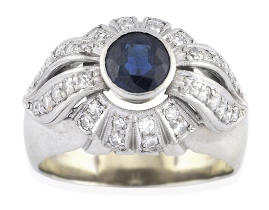 Of Retro design, the domed geometric cluster centrally set with a round sapphire collet set within a pierced diamond set surround, in 18ct white gold, ring size S-T.