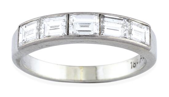 Comprising five emerald cut diamonds totalling 1.25cts, channel set in 18ct white gold, ring size N-O.