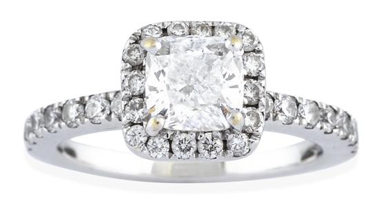 Centrally set with a cushion cut diamond weighing 1.20cts with GIA laser inscribed girdle, surrounded by a border of round brilliant cut diamonds, in 18ct white gold, GIA certificate and independent valuation available, ring size K-L.