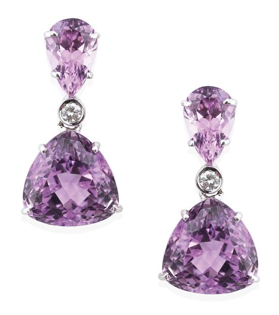 Each earring comprising a fancy trilliant cut kunzite suspended below a diamond set drop and a pear cut kunzite stud fitting, in 18ct white gold, independent valuation available.