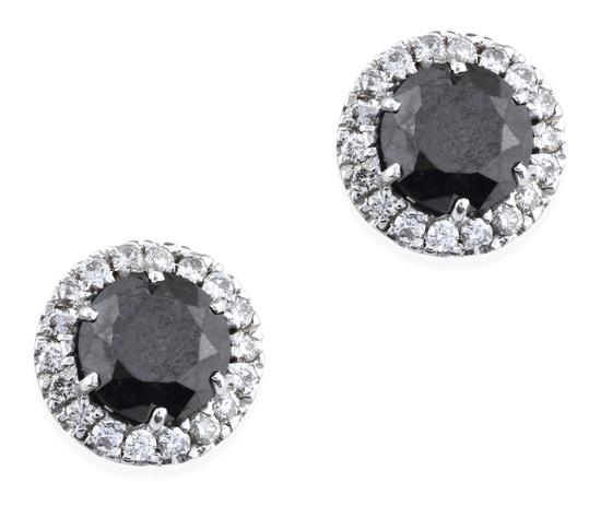 Each stud set with a round black diamond weighing 2.46cts, surrounded by a border of white diamonds, to post and butterfly fittings, in 18ct white gold, independent valuation available.