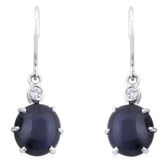 Of cluster design, centrally set with an oval sapphire cut en cabochon weighing 5.30cts, to a diamond set surmount and shepherd hook fittings, in 18ct white gold.