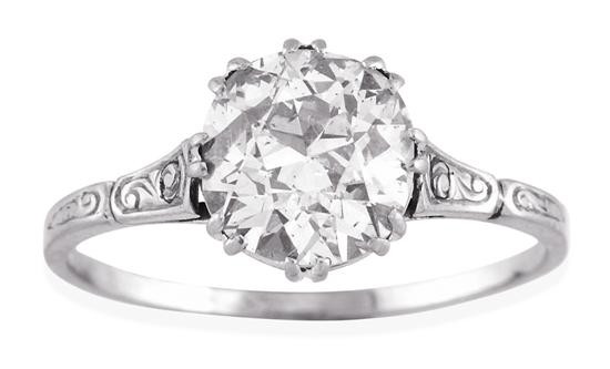 The old European cut diamond weighing 2.40cts, in an eight claw setting with diamond set shoulders, in platinum, independent valuation available, ring size Q-R.