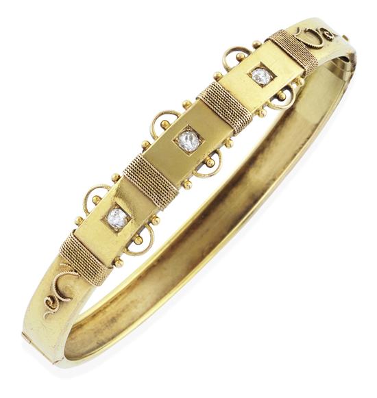The hinged bangle, set with three old European cut diamonds with applied gold detail, in 15ct gold, in original box.