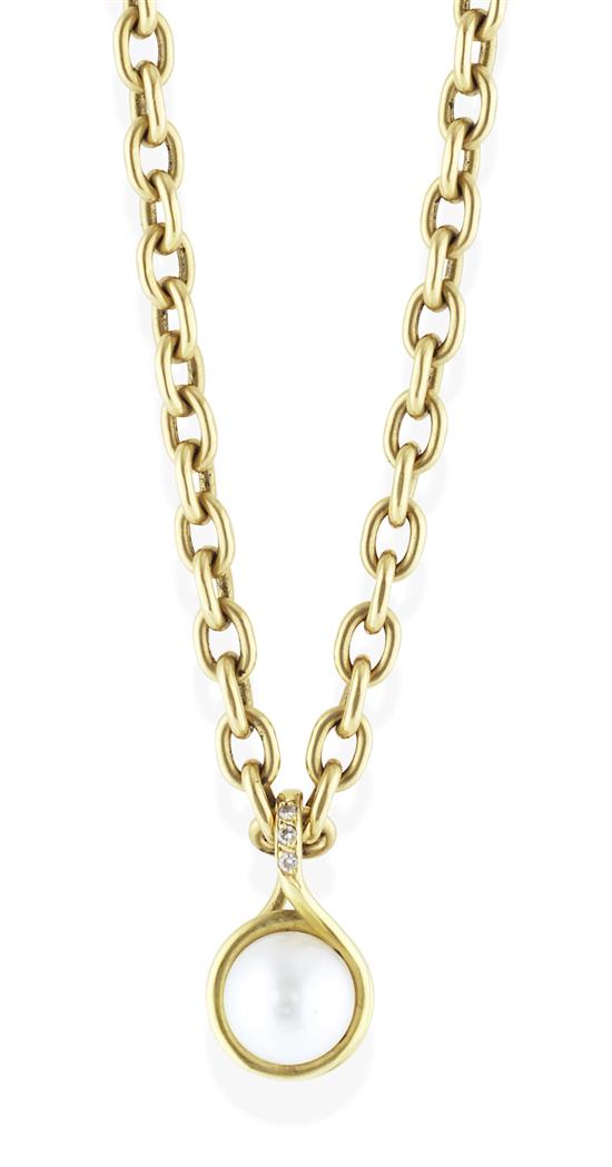 The button shaped pearl in diamond set mount, together with a belcher link chain hand made by Don Bannister, in 18ct gold, from the Makers Mark Studio Collection, circa 1998.