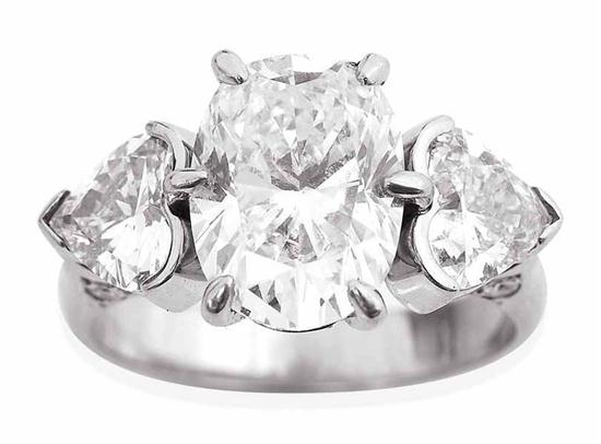 Centrally set with an oval diamond weighing 3.36cts, flanked by a heart cut diamond to each side weighing 0.71cts and 0.82cts respectively, in platinum, GIA certificate and independent valuation available, ring size M-N.