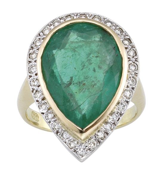 Centrally set with a pear cut emerald weighing 10.0cts, surrounded by single cut diamonds totalling 0.42cts, in 18ct gold, independent valuation available, ring size O-P.