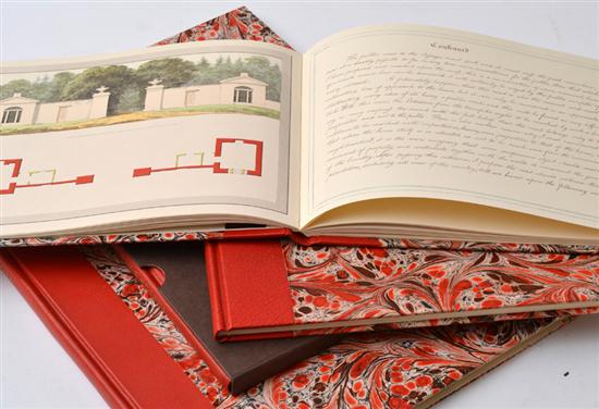 The Basilisk Press, London, 1976, four volumes bound in quarter red leather with hand marbled red boards, all housed in brown cloth slip cases, four volumes being, Sheringham Hall, Anthony House, Attingham park and the fourth volume is Repton's Red Books, an explanatory volume by Edward Malins, limited edition set 300 of 500