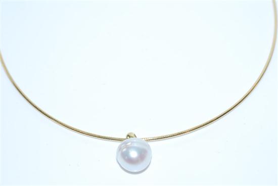 The button shaped pearl of silver white hues, measuring 14.0mm, suspended on an omega collar, in 18ct gold, boxed with papers.