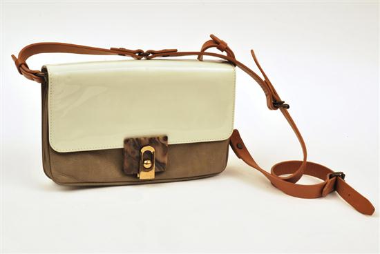 The taupe leather bag with contrast white patent leather flap and tan shoulder strap, 25 x 15cm.