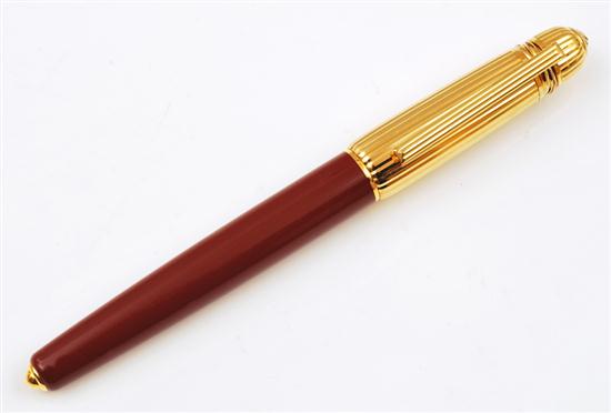The fountain pen with red composite case, 18ct gold nib and diamond set trinity gold plated cap, circa 1989.
