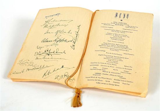 R.M.S. 'Monowai' dinner menu, dated 16 September, 1932, with passenger's name 'Miss T. Donald' printed to front cover, with twelve ink signatures inside front cover including Don Bradman, Victor Richardson, Stan McAbe, Alan Kippax and Leslie Fleetwood-Smith