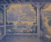 NORMAN LLOYD, LADY VIEWED THROUGH VERANDAH, OIL ON CANVAS, 49.5 X 60CM
