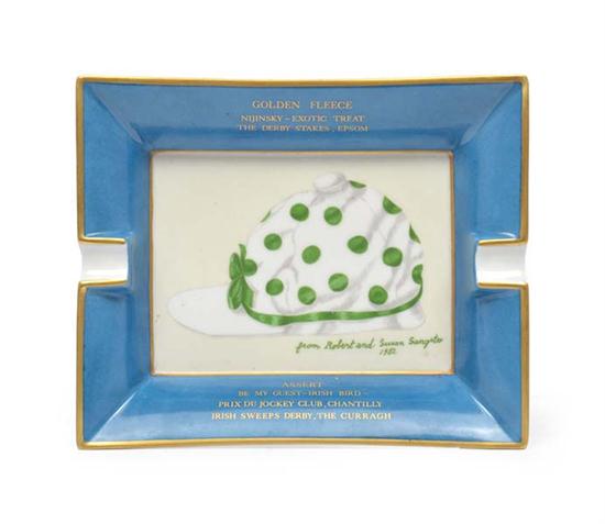 rectangular form with a jockey hat motif, within a blue and gold border, with gilt lettering 'ASSERT/ BE MY GUEST - IRISH BIRD -/ PRIX DU JOCKEY CLUB, CHANTILLY/ IRISH SWEEPS DERBY, THE CURRAGH' and inscription 'from Robert and Susan Sangster/ 1982'