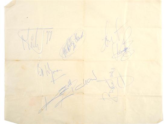 signed in blue ink on a thin sheet of paper by all five of the original members of the group including Mick Jagger, Keith Richards, Brian Jones, Bill Wyman and Charlie Watts, some folds and creases
