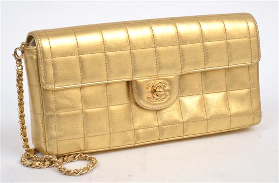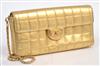 Styled in quilted gold leather with gold metal clasp and conforming woven leather chain shoulder strap, 26 x 14cm.