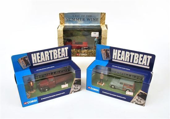 THREE CORGI SETS INCLUDING CC01601 LAST OF THE SUMMER WINE TRIUMPH HERALD CONVERTIBLE AND EDIE PEGDEN FIGURE; CC01701 HEART BEAT MORRIS MINOR TRAVELLER & FIGURE; AND CC07301 HEART BEAT MORRIS COMMERCIAL TRUCK (M BOXES M) (3)