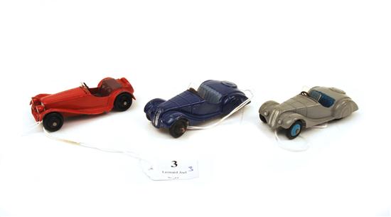 THREE DINKY MODELS INCLUDING 38A FRAZER NASH BMW SPORTS, ONE SPECIAL ISSUE 'HORNBY SERIES' TINPLATE SHEET BASE, DARK BLUE WITH LIGHT BLUE INTERIOR AND SMOOTH BLACK HUBS; ONE GREY WITH BLUE INTERIOR AND RIDGED LIGHT BLUE HUBS; AND 38F JAGUAR SS100 SPORTS CAR, RED WITH MAROON INTERIOR, ALL UNBOXED (VG-E) (3)