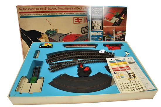 TRIANG HORNBY MINIC R.M.D MOTORAIL WITH FULL SET AND FULL PAGE OF ORIGINAL DECALS AND ALL PAMPHLETS; AND MINIC M/1818 REVERSING HAZARD AUTOMATED ACCESSORY PACK, UNCHECKED (M BOXES E) (2)