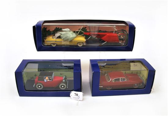 THREE EN VOITURE TINTIN FIGURES FROM TINTIN COMICS INCLUDING 1945 REF 118 013; 1956 REF 118 040; AND1956 REF 118 048 (M BOXES E-M) (3)