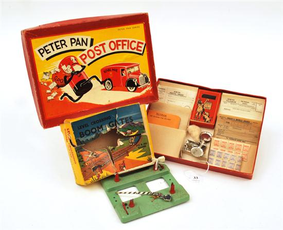 PETER PAN POST OFFICE SET; MATCHBOX BUILD A ROAD DELUXE; AND F.W. STRONG & CO., MELBOURNE BOOM GATES WITH ONE ARM DETACHED (F-M BOXES P-M) (3)