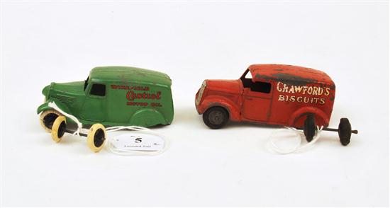 TWO DINKY PRE-WAR MODELS INCLUDING 28M DELIVERY VAN 'CASTROL'; AND 28P DELIVERY VAN 'CRAWFORD'S BISCUITS', BOTH WITH DETACHED BACK WHEELS, FATIGUE, UNBOXED (P-F) (2)