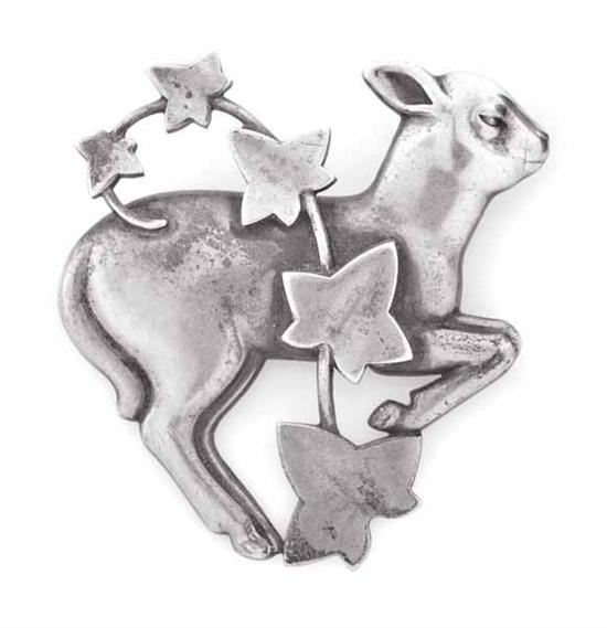 Designed as a lamb leaping through an ivy leaf garland, in sterling silver, reference 311, circa 1960, boxed.