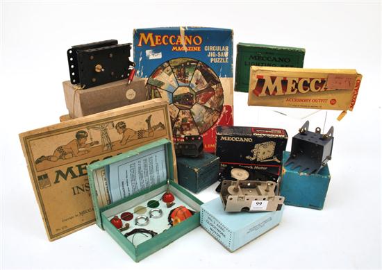 MECCANO GROUP LOT OF PRE AND POST WAR ITEMS INCLUDING ORIGINAL M280 LIGHTING SET SEWN IN; M230 AERO CLOCKWORK MOTOR NO.1; E15R ELECTRIC MOTOR; CLOCKWORK MOTOR; ACCESSORY OUTFIT; PAMPHLETS AND OTHERS, ALL BOXED (G-E BOXES P-G) (LOT)