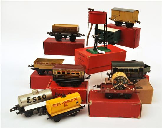 COLLECTION OF HORNBY ROLLING STOCK AND NO.1 WATER TANK INCLUDING CLOCKWORK PASSENGER COACH VOITURE; FLAT TRUCK WITH CABLE DRUM; NO.1 SIDE TIPPING WAGON; NO.1 ROTARY TIPPING WAGON; AND OTHERS (F-E BOXES F-E) (LOT)