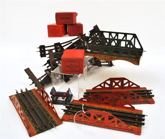 COLLECTION OF HORNBY STOCK INCLUDING 5 X NO.1 BUFFER STOP; HORNBY GIRDER BRIDGE; 3 X METTOY GIRDER BRIDGES; RIGHT HAND 3-RAIL POINTS; 2 X LEFT-HAND 3-RAIL POINTS; AND 2 X Y-JUNCTION (P-E BOXES P-E) (LOT)