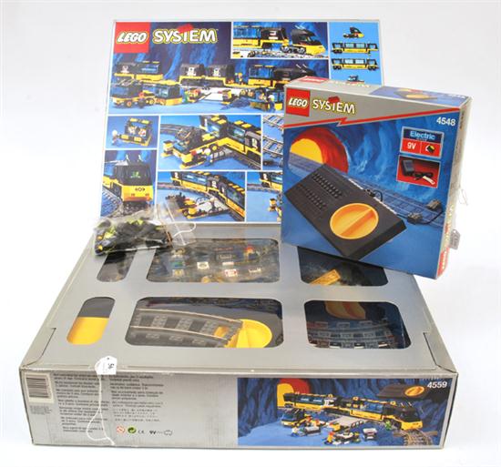 LEGO 4559 9 VOLT ELECTRIC SYSTEM CARGO RAILWAY SHUTTLE EXPRESS, MINT UNOPENED; 4548 9 VOLT ELECTRIC SYSTEM AND UNBOXED LEGO SPACE FIGURES (M BOX M) (3)