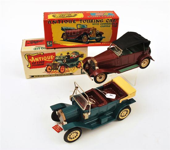 TWO SSS (JAPAN) ANTIQUE MODELS, ONE DE LUXE TOURER; AND ONE TOURING CAR WITH CONVERTIBLE CANVAS TOP (M BOXES E-M) (2)